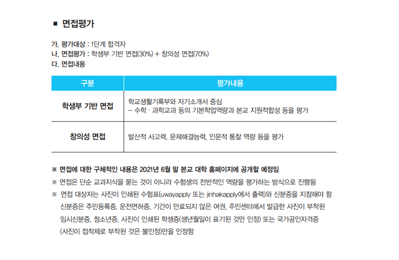 수시모집 일정은 9월 10일부터 14일까지입니다. 제출서류는 학교생활기록부와 자기소개서 필수입니다. 1단계 서류평가 100% 비율로 4배수를 선발하며 1단계 합격자 발표일은 11월 19일입니다. 2단계는 1단계 점수 50%, 면접 50% 비율로 전형을 진행합니다. 면접의 비중이 상당히 높습니다. 면접 평가 내용을 보면 학생부 기반 면접 30%, 창의성 면접 70%입니다. 창의성 면접에서는 발산적 사고력, 문제해결능력, 인문적 통찰 역량 등을 평가합니다. 면접에 대한 구체적인 내용은 2021년 6월 말 본교 대학 홈페이지에 공개할 예정이라고 공개되어 있으니 이때 확인하면 도움이 되겠습니다. 서류 평가에서는 가치 평가, 역량 평가, 지원 적합성 등을 평가 지표로 활용할 예정인데 수학, 과학 과목 우수자에게 많이 유리할 것으로 보입니다.