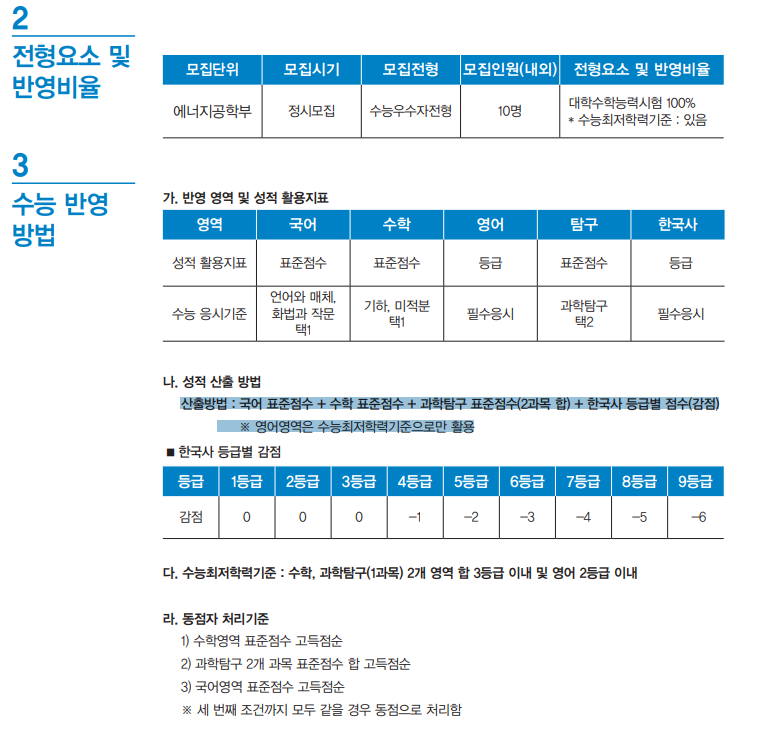 10명을 선발하는 정시 모집은 수능시험 성적 100% 반영입니다. 한국에너지공대는 특별법에 의한 대학으로 정시모집 군에 속하지 않는 군외모집 대학이라 다른 대학 정시모집 지원을 했어도 지원이 가능합니다. 수능 최저학력 기준이 있으며 수학, 과학탐구(1과목) 2개 영역 합 3등급 이내 및 영어 2등급 이내입니다. 성적 산출방법은 국어 표준점수 + 수학 표준점수 + 과학탐구 표준점수(2과목 합) + 한국사 등급별 점수(감점), 영어영역은 수능최저학력기준으로만 활용합니다.
