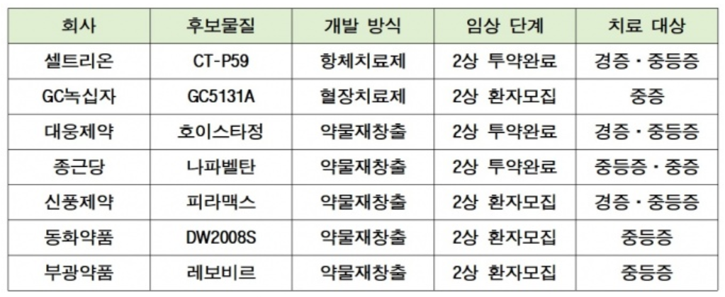 현재 기준으로 셀트리온의 항체치료제 CT-P59는 2상 투약이 완료되어 코로나 19환자 접촉자 대상 예방적 유효성, 안전성 평가를 위한 임상 3상 단계에 있습니다. GC 녹십자의 혈장치료제인 GC5131A는 2상 임상 진행중으로 유효성 및 안전성 평가 단계입니다. 대웅제약, 정근당, 신풍제약, 동화약품, 부광약품에서 개발, 임상 진행중인 치료제는 기존 약물 재창출 방식을 통하여 코로나에 대응할 수 있는지 여부를 검증하고 있습니다.