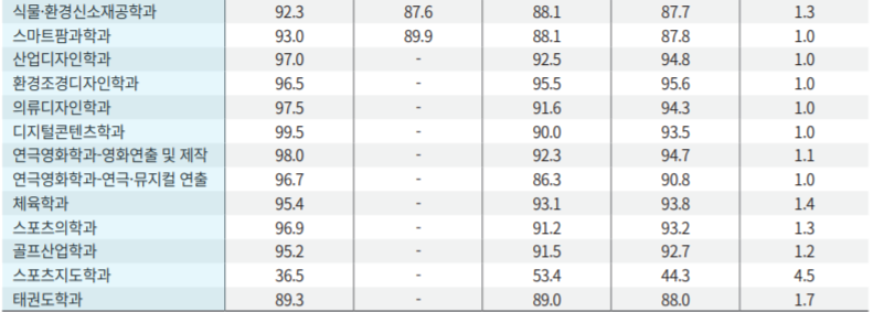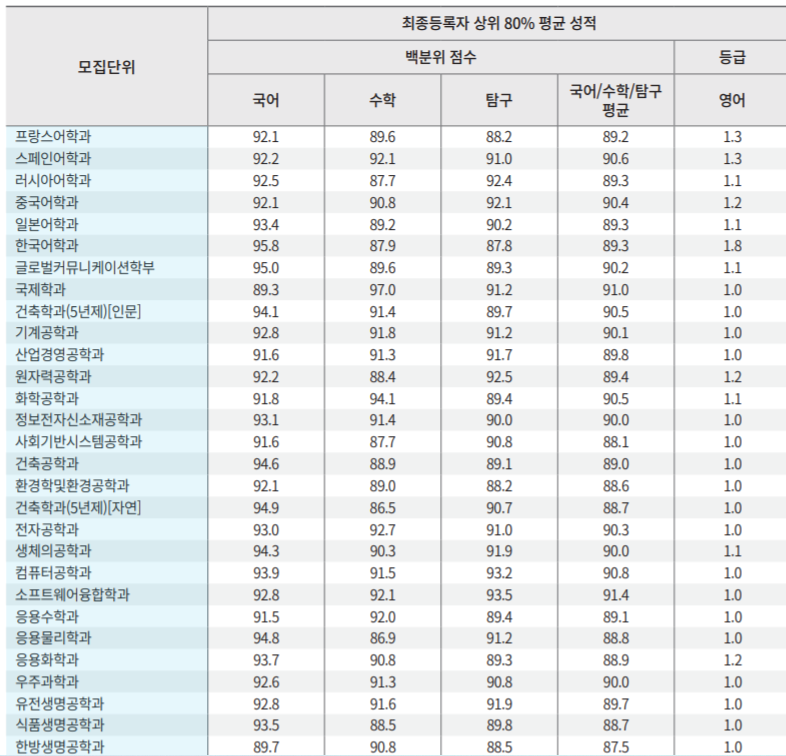 정시등급 나군으로 모집하는 국제캠퍼스 정시 등급 백분위를 살펴 보겠습니다. 최종등록자 상위 80% 국어, 수학, 탐구 평균 백분위 점수입니다. 프랑스어학 89.2, 스페인어학 90.6, 한국어학 89.3, 국제학 91.0, 기계공학 90.1, 원자력공학 89.4, 화학공학 90.5, 건축공학 89.0, 전자공학 90.3, 컴퓨터공학 90.8, 응용수학 89.1, 우주과학 90.0, 환경조경디자인 95.6, 디지털콘텐츠 93.5, 스포츠의학 93.2, 골프산업 92.7이었습니다.