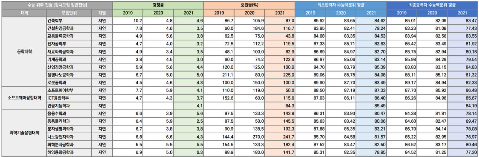 정시 모집 최종등록자 수능백분위 평균은 한양대학교에서 공개한 자료입니다. 자연계열은 국어, 수학(가), 과탐(2과목), 인문·상경계열 국어, 수학(나), 사탐(2과목)입니다. 정시모집은 가군과 나군으로 구분하여 모집합니다. 참고로 수능 점수(국어, 수학, 탐구) 백분위 기준으로 96~100점 1등급, 89~95 2등급, 77~88 3등급, 60~76점 4등급으로 보면 됩니다. 한양대 에리카 주요 학과 정시 백분위 점수를 보면 건축학부 83.47, 전자공학 81.92, 로봇공학 82.33, 인공지능 84.19, 응용수학 78.14, 화학분자공학 80.46, 한국언어문학 83.18, 문화컨텐츠 83.42, 중국 82.92, 광고홍보 85.46, 경제 83.60, 보험계리 85.74, 산업디자인 75.05입니다. 대체적으로 3등급 초반대 점수에서 합격선이 형성되어 있습니다.