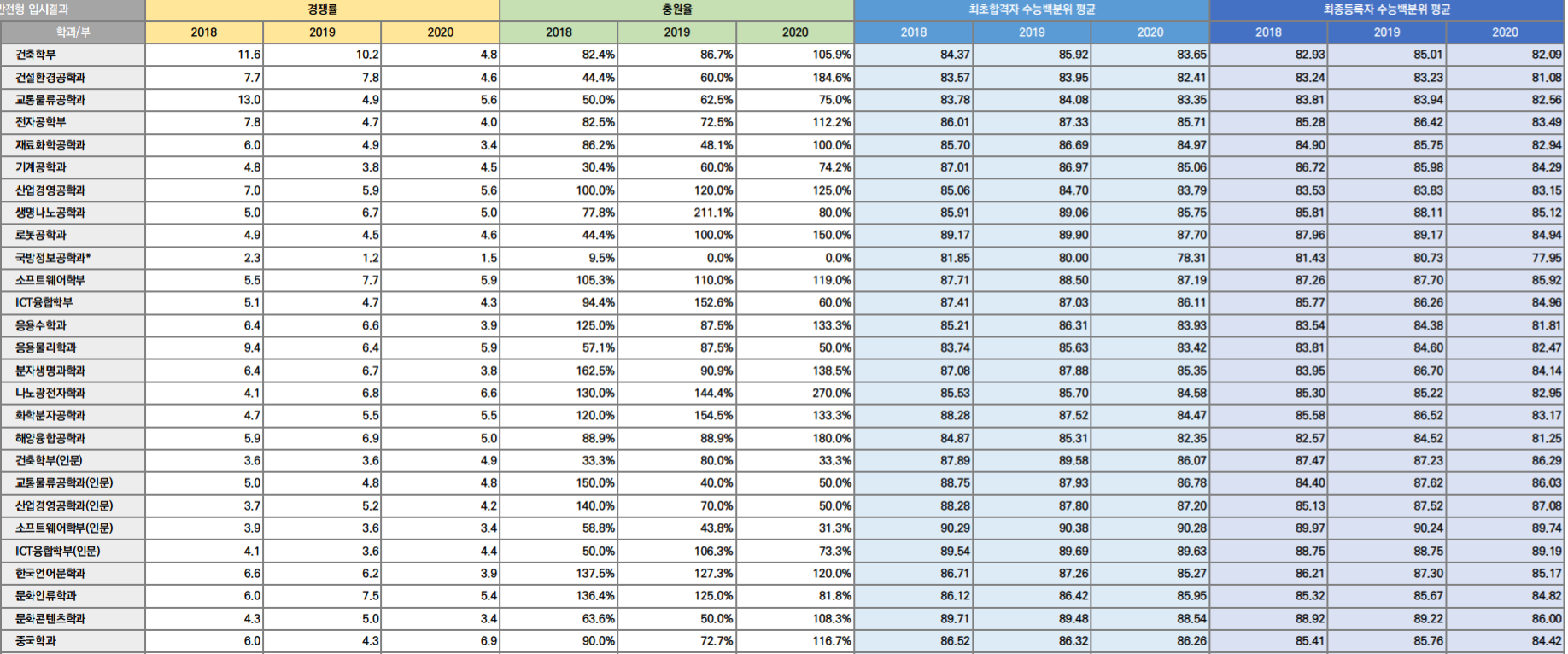 수능 위주인 정시 등급의 경우 자연계는 평균 수능 백분위는 85.61, 인문계는 87.72, 예체능은 76.36이었습니다. 수능 등급으로 환산하면 자연계는 3.3등급, 인문계는 3.1등급 정도입니다. 대체로 인문계 학과의 정시등급이 다소 높은 편이며 가장 높은 등급이 필요한 학과는 인문 소프트웨어학부 90.24였습니다. 건축 85.01, 기계공학 85.98, 응용물리 84.60, 문화인류 85.67, 영미언어 85.98, 광고홍보 89.14, 보험계리 90.17등입니다. 정시 모집 시 참고하시면 되겠습니다.