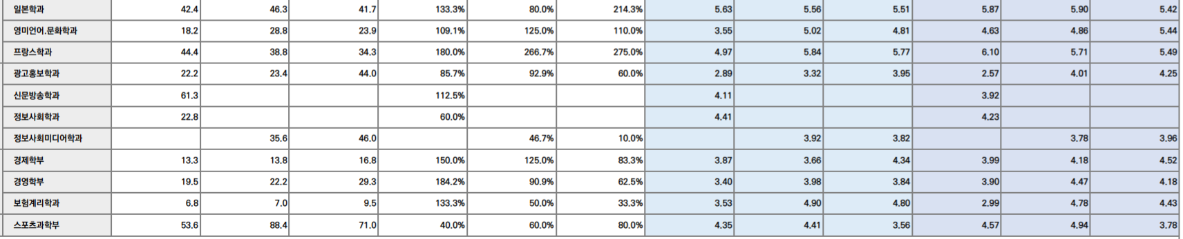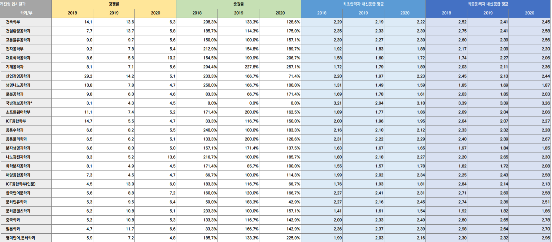 학생부 종합의 교과 성적은 정성 평가이므로 등급은 참고하시면 되겠습니다. 자연계는 3등급 중반~4등급 중반, 인문계는 4등급 초반~5등급 중반까지입니다. 몇몇 학과를 보면 건축 4.24, 로봇공학 3.53, ICT융합 4.51, 응용수학 3.19, 나노광전자 3.35, 한국언어문학 4.33, 일본학 5.42, 광고홍보 4.25, 경제 4.52, 경영 4.18입니다.