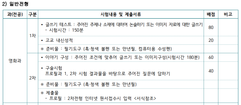 과거에는 고교 내신의 비중이 적지 않아 최소 2등급 이상은 되어야 하는 것으로 예상됩니다. 여기에 언어능력평가와 영어능력평가 시험도 봐야 해서 부담이 적지 않았습니다. 그러나 2022년도부터는 입시 요강에 변동이 발생되었습니다. 영화과의 경우 논술형 글쓰기가 신설되고 80% 비중, 내신은 20%입니다. 논술형 글쓰기는 논술 시험으로 이해하면 되겠습니다. 영화과 1차 시험은 주어진 주제나 소재에 대하여 논술하기 또는 이미지 자료에 대한 글쓰기로 시험시간은 150분입니다.