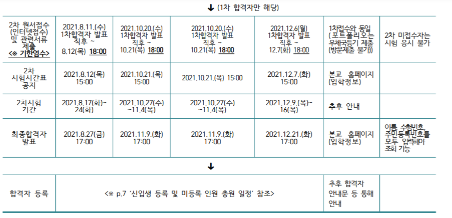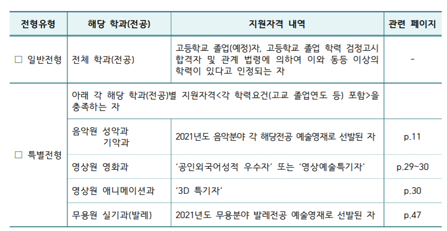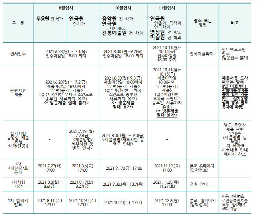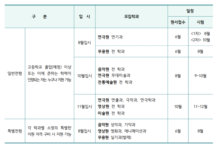 연극원 연기과, 무용원 전학과는 6월28일~7월 1일 원서 접수, 8월17~24일 시험, 음악원 전 학과, 연극원 무대미술과, 전통예술원 전 학과는 8월30일~9월2일 원서접수, 9월30일~10월7일 시험(1차), 연극원 연출과,극작과,연극학과, 영상원 전 학과, 미술원 전 학과는 10월11일~10월14일 원서접수, 11월25~27일 시험(1차)을 치르게 됩니다. 정원내 일반 전형 기준입니다. 2차 시험은 1차 시험 합격자에 한하며 표를 참고하시기 바랍니다. 2022년도 모집 인원은 음악원 133명, 연극원 85, 영상원 105, 무용원 60, 미술원 90, 전통예술원 85명 등 총 558명 모집 예정이며 특별전형 포함입니다. 모든 전형에서 학교생활기록부 전 학년, 전 교과목 교과성적을 반영합니다.