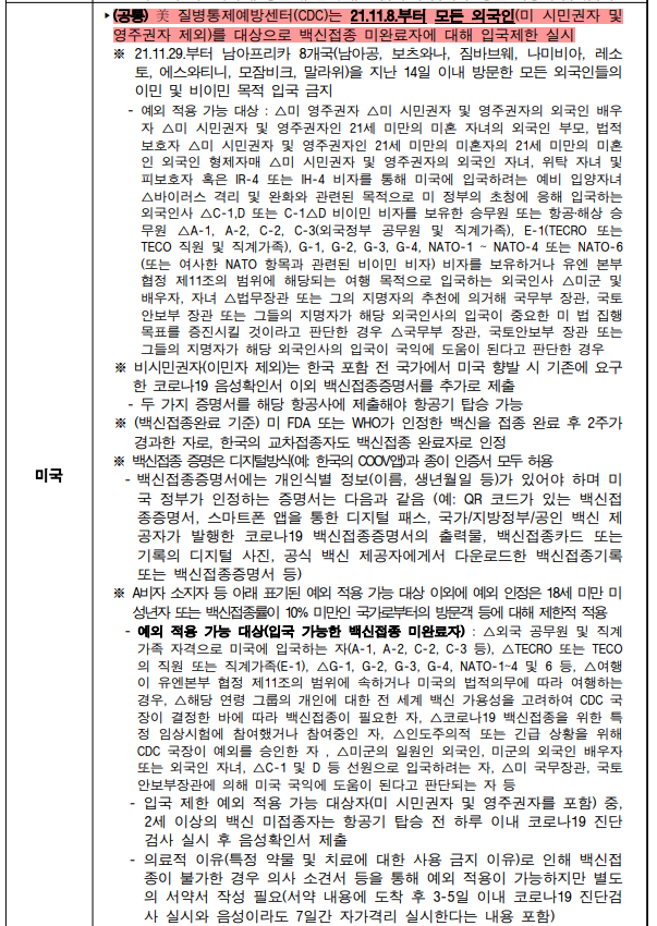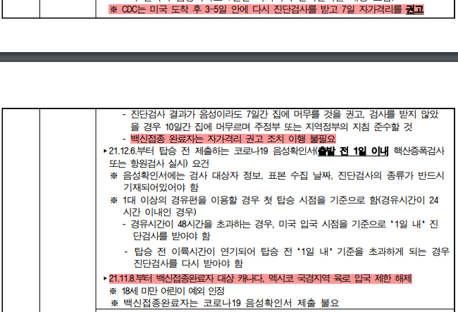 주요 국가를 살펴 보면 미국은 12월 6일 14시(한국 시간 기준)이후 출발하는 미국행 탑승객 대상으로 출발 1일 전 검사한 COVID-19 음성확인서 제출 시행이 의무화되었습니다. 캐나다는 백신 접종 완료 후 14일 경과 승객의 경우 관광/방문 목적 입국 허용하고 있으나 COVID-19 PCR 음성확인서, ArriveCAN 앱을 통한 자가 격리 계획 및 백신 접종 내용 입력이 필요합니다. 캐나다는 12월 4일부터 모든 승객 캐나다 도착 직후 PCR 검사를 실시하고 결과가 확인되기 전까지 ArrvieCAN에 입력한 예약 호텔이나 자가 격리 장소에서 검사 결과를 대기해야 합니다. 백신 미접종자는 14일 자가격리 의무 사항입니다.