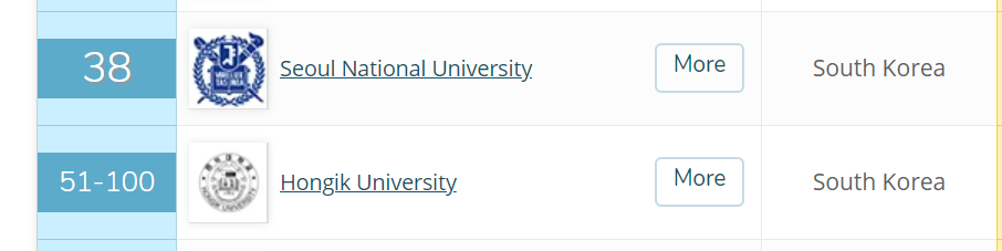 QS 세계 미대 랭킹에서는 서울대 미대가 38위를 기록하며 국내 1위, 홍익대는 51~100위 그룹으로 국내 2위를 기록하고 있습니다. 2019년 중앙일보에서는 27위를 기록했습니다. 입시에서는 건국대, 동국대와 더불어 같은 라인에 포진되어 있어 입학하기 쉬운 대학이 아닙니다. 홍익대학교는 서울캠퍼스와 세종캠퍼스 등 두개의 캠퍼스를 운영하고 있습니다.