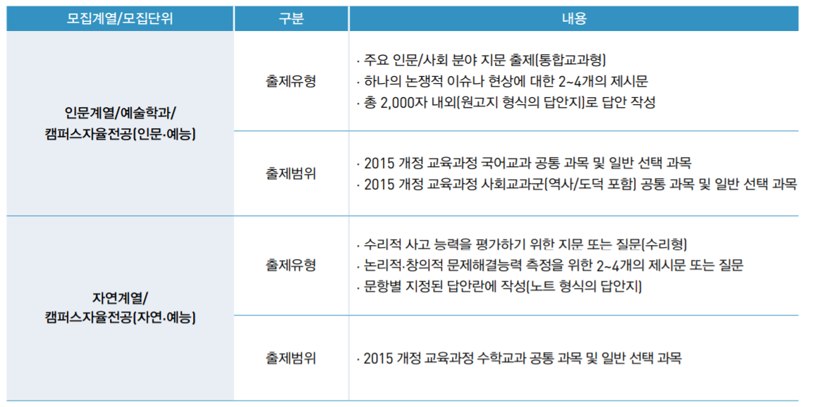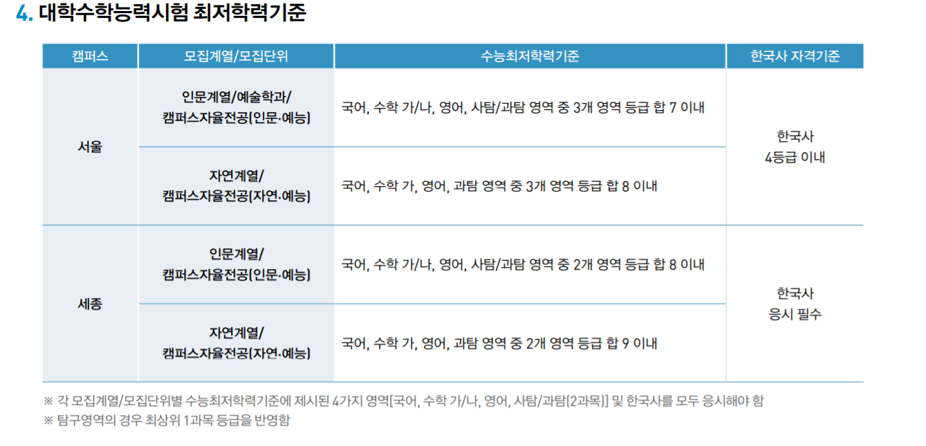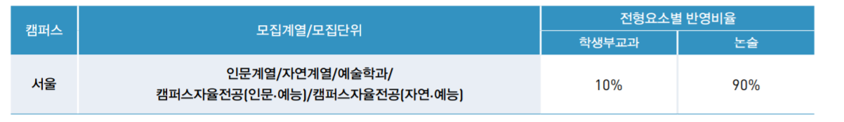 논술전형은 학생부 교과 10%, 논술 90%로 논술의 비중이 압도적으로 높습니다. 시험시간은 120분이며 2~4개의 지문을 제시합니다. 역시 수능최저기준이 있습니다. 학생부교과, 종합 전형 기준과 동일한 기준입니다.