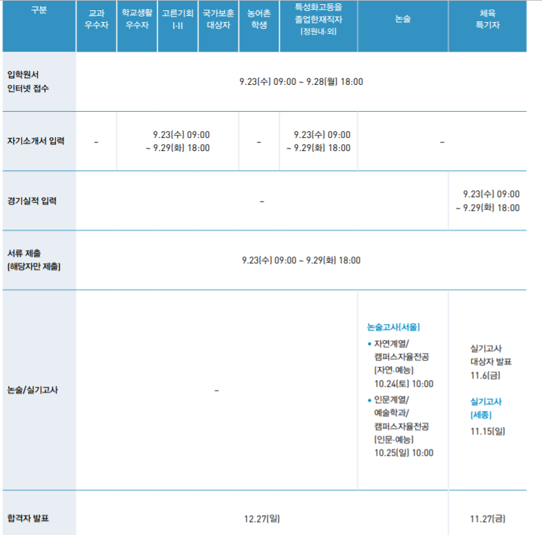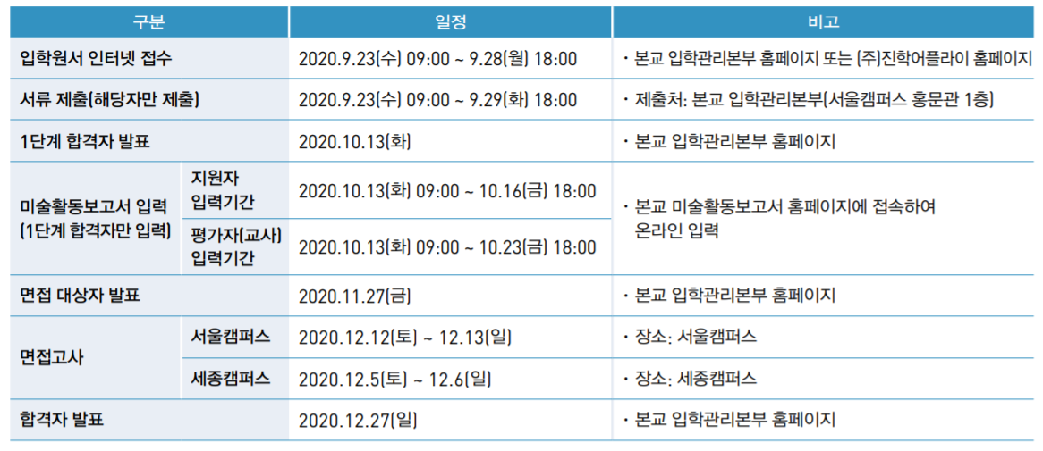 홍익대의 경우 모든 전형에서 수능 최저기준이 있음을 유의해야 하겠습니다. 면접은 미술우수자만 실시하며 자기소개서는 학생부종합에만 제출합니다. 홍익대학교 수시 모집 입학원서 접수는 9월 23일부터 28일까지입니다.