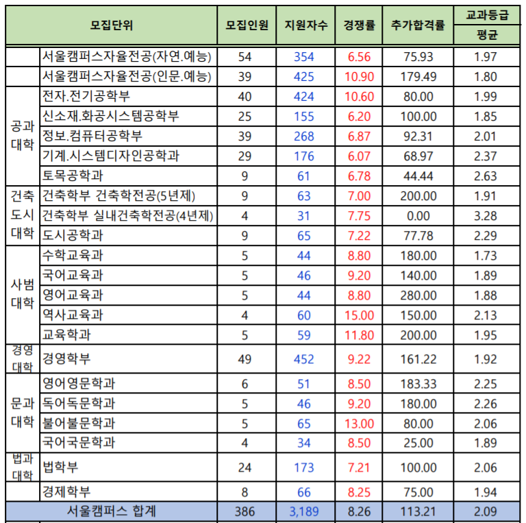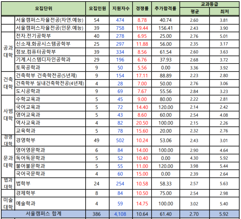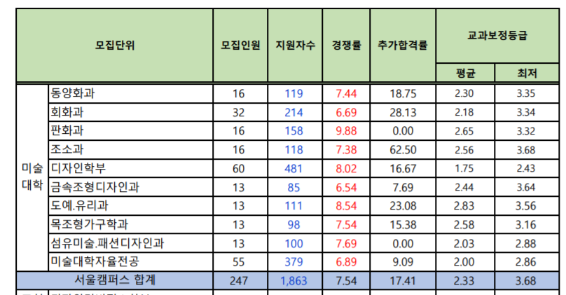 학생부종합, 학교생활우수자전형에서는 거의 대부분 2등급 중반 대이며 독어독문 4.30, 불어 불문 3.98 같이 낮은 학과도 있지만 내신 등급이 낮은 외고 학생들이 많이 지원했을 가능성이 있습니다. 따라서 일반고 학생들은 신중한 접근이 필요합니다. 미술우수자 전형도 2등급 초반에서 중반 대인데 예술고 학생들이 주로 지원하는 전형입니다.