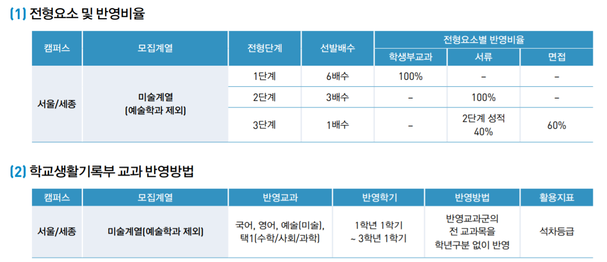 홍익대가 발표한 2021수시 모집요강에 기반하여 어떻게 진행되는지 살펴보도록 하겠습니다. 주요 수시모집으로는 학생부 교과전형, 학교생활우수자전형(학생부 종합), 미술우수자 전형, 논술 전형이 있습니다. 서울 캠퍼스 기준으로 학생부 교과는 383명, 학생부종합은 383명, 미술우수자 247명, 논술 전형 383명을 선발합니다.