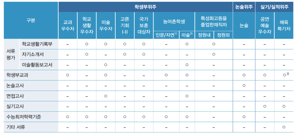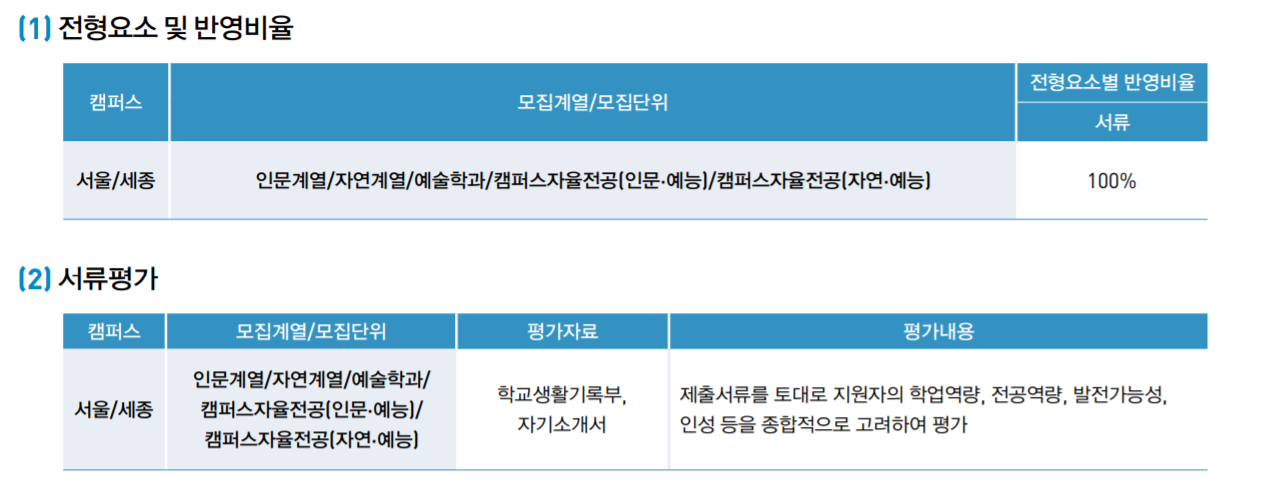 학교생활우수자 전형은 학생부와 자기소개서 100%로 선발하는 전형입니다. 역시 수능최저기준이 있으며 기준은 학생부교과와 동일합니다. 면접은 실시하지 않습니다. 평가 항목은 발전가능성, 학업역량, 전공역량, 인성입니다.