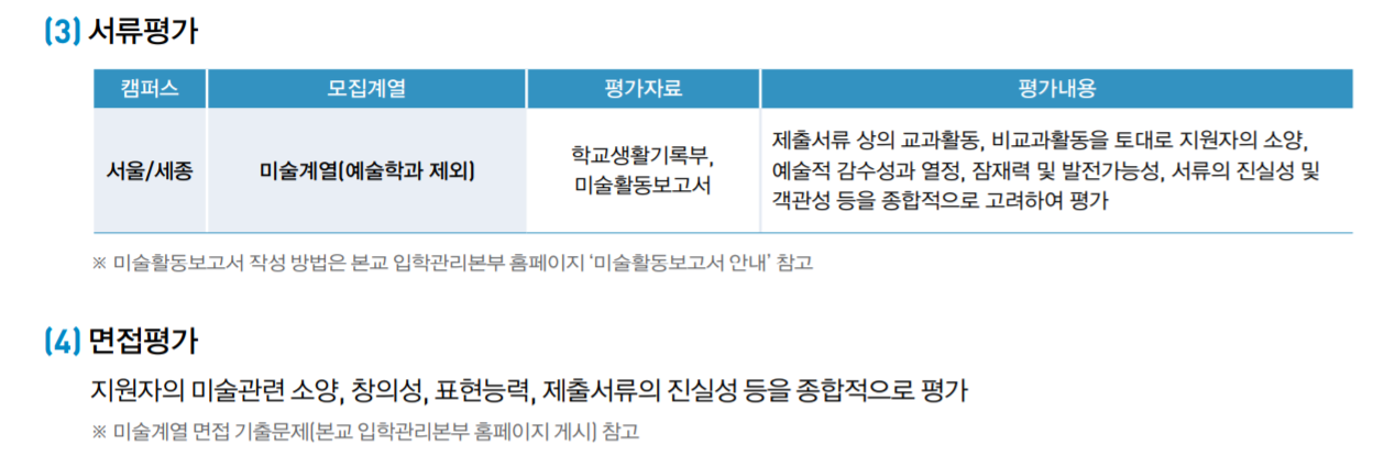 미술우수자 전형은 홍익대 만의 특색있는 전형입니다. 미술대학 지원자로총 3단계에 걸쳐 실시되는데 1단계는 학생부 교과 100%로 6배수를 선발하고 2단계는 학생부와 미술활동보고서 100% 반영하는 서류 평가로 3배수, 마지막 3단계에서 2단계 성적 40%, 면접은 60% 실시하여 선발합니다. 동점자 처리 기준에서 미술교과 성적이 가장 좋아야 하며 다음으로 국어, 영어 순입니다. 면접에서는 미술관련 소양, 창의성, 표현 능력 등을 평가합니다. 수능최저 기준이 있으며 국,수,영,탐 3개영역 등급합 9이내여야 하며 한국사 4급은 필수입니다.