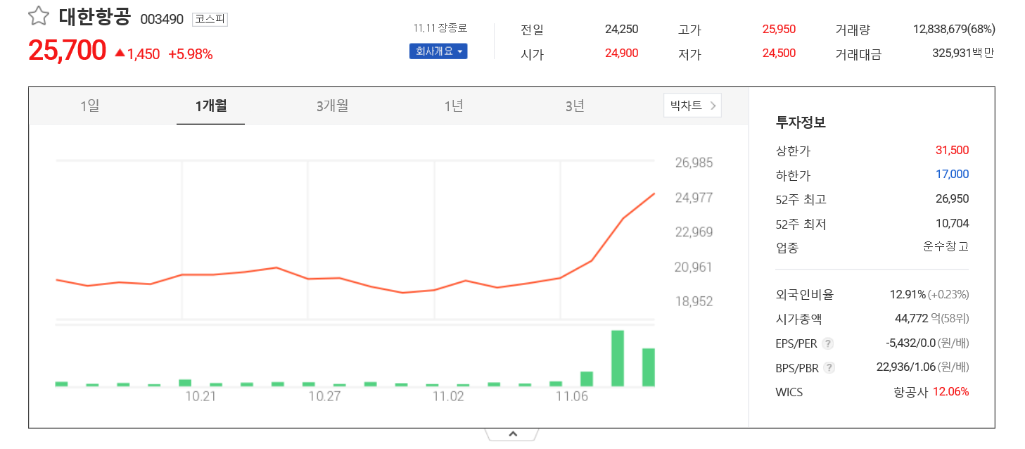 대한항공(003490, 코스피)은 국내 최대 항공사로 역시 피해가 적지 않은데 그럼에도 불구하고 화물 수송에 힘입어 적자는 면하고 있어 그나마 선방하고 있습니다. 여객 수요는 사실상 초토화된 상황이지만 화물 수요를 제대로 이용하여 수익을 극대화 하여 많은 어려움에도 불구하고 지난 3분기에 매출 1조 5508억원, 영업이익은 76억원을 달성하였습니다. 영업이익 달성은 2분기에 이어 연속된 것입니다. 화이자 백신 소식이 전해지며 당장은 아니라도 여객 수요가 살아날 것으로 기대하는 희망과 백신 화물 수송에 대한 기대감으로 주가는 연일 상승하고 있습니다. 10일에는 전일 대비 11.24% 상승하며 24,250원으로 종료되었으며 11일에도 역시 상승하며 25,700원 종가를 기록했습니다.