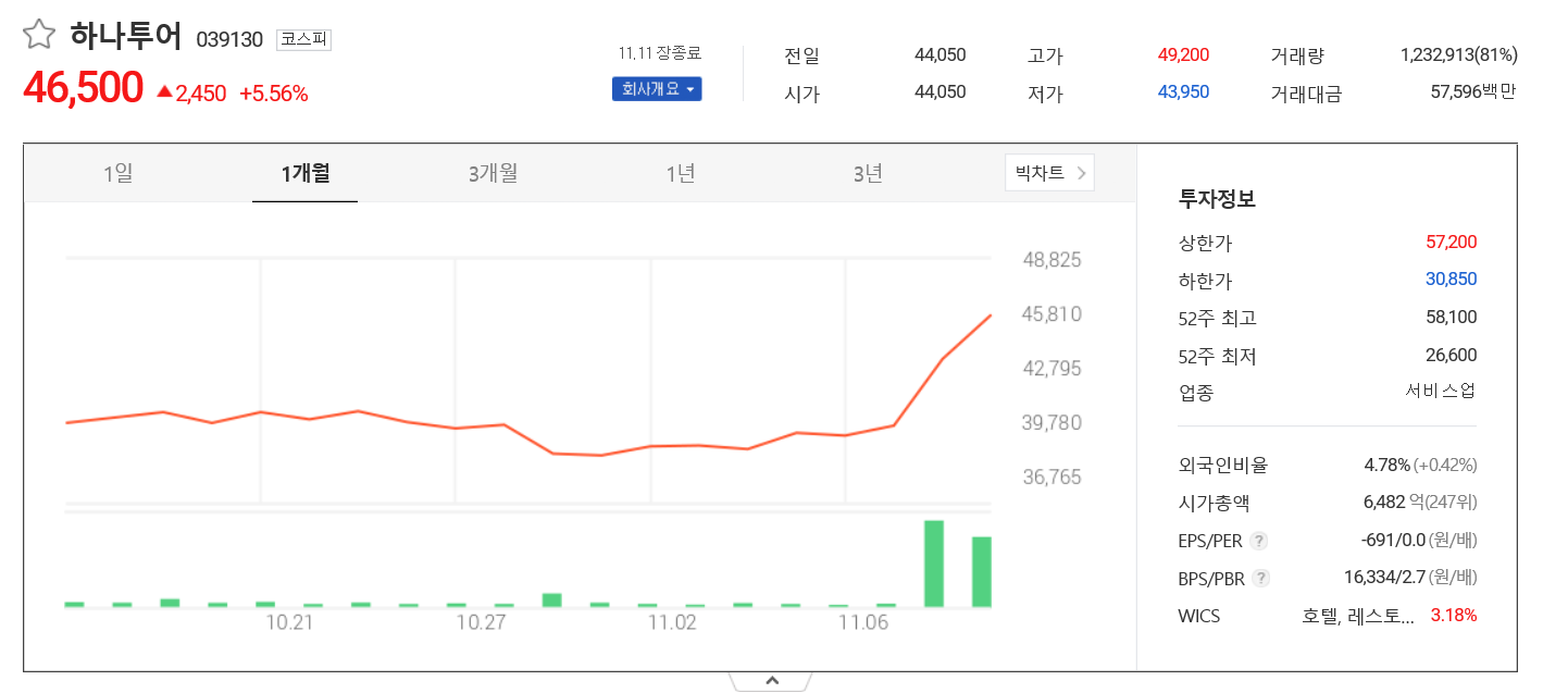 국내 최대 여행사인 하나투어(039130, 코스피)도 역시 코로나 백신 개발이 가져올 코로나 종식을 기대하며 주가가 상승하였습니다. 코로나가 종식된다는 것은 막혔던 국가간의 여행이 재개될 수 있는 것이어서 항공사와 더불어 여행사에게는 큰 호재가 됩니다. 하나투어 주가는 11월 1일 기준 전일 대비 5.56% 상승한 종가 46,500원으로 마감되었습니다.