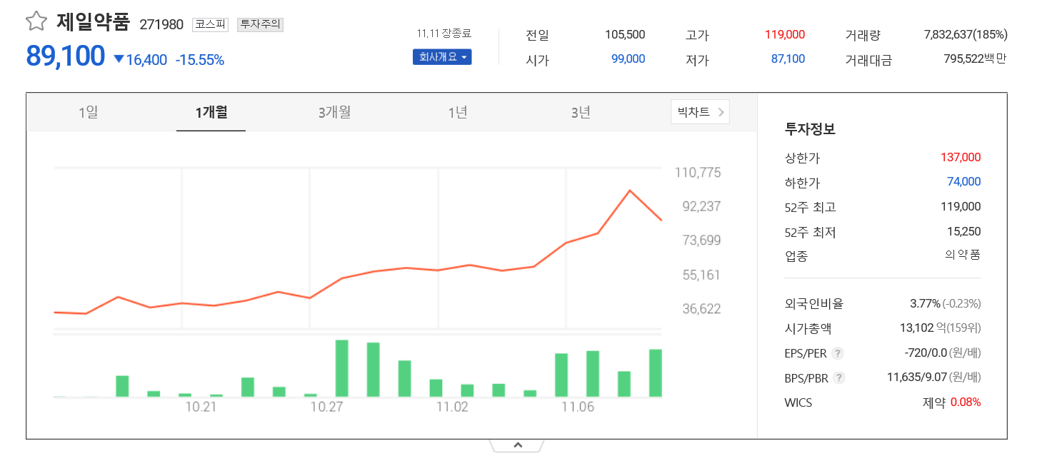 제일약품(271980, 코스피)는 이 회사의 대표가 한국 화이자에서 근무했었던 경력과 파트너쉽을 유지하고 있다는 소식이 전해지며 관련주로 분류되고 있습니다. 이 회사는 화이자에서 제조한 약품도 판매하고 있습니다. 역시 큰 폭으로 주가가 상승하기도 했지만 11일에는 15% 이상 하락하며 16,400원 종가를 기록했습니다. 관심있게 볼 필요는 있지만 무작정 투자는 신중해야 하겠습니다.