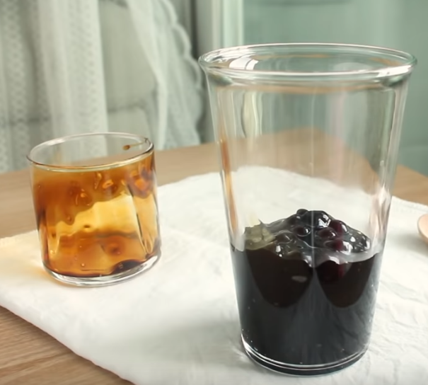 이렇게 완성된 흑당시럽에 타피오카펄을 컵에 같이 넣고 우유와 취향에 따라 홍차도 같이 넣어주면 흑당밀크티가 완성됩니다. 얼음을 넣어주면 시원하게 마실 수 있습니다.