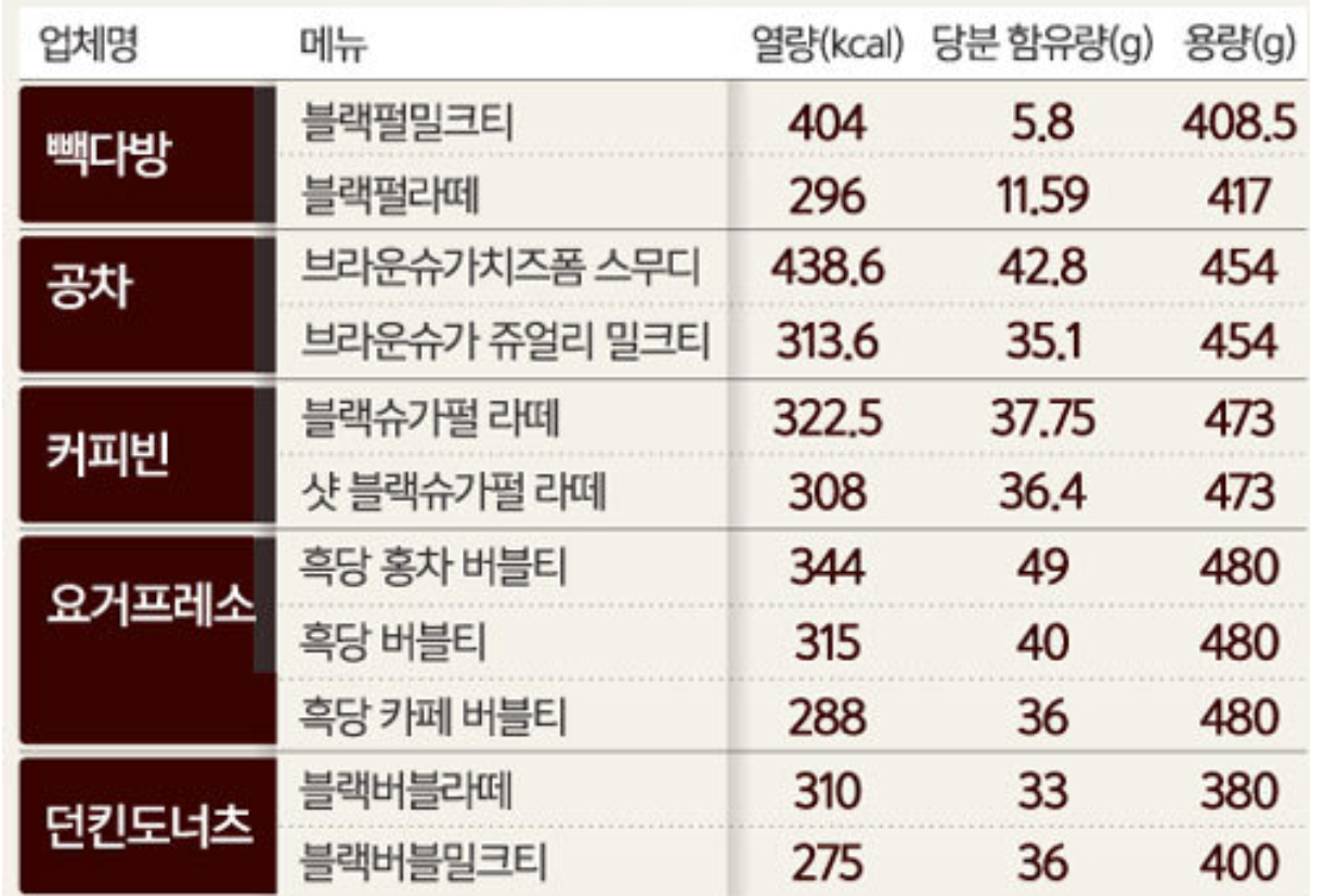 시중에서 판매되는 흑당밀크티의 칼로리는 제품에 따라 다른데 275~438kcal이니 비교적 높은 편입니다. 설탕이 들어가는 제품이라는 것을 감안하고 마셔야 될 것 같습니다.