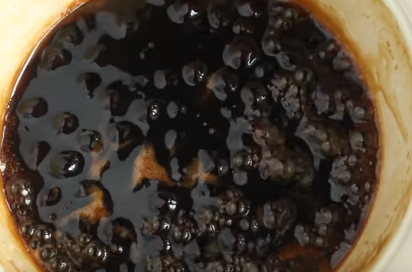다음으로 흑당시럽을 만드는 과정인데 끓는 물에 흑당을 넣어주면 되는데 이때 중요한 것은 중불로 끓이고 젓지 않도록 하는 것이 포인트라고 합니다. 적당히 가열이 되어 녹으면 전문점에서 파는 것과 같은 시럽이 완성됩니다.