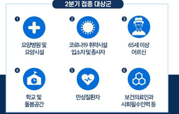 2분기 백신 접종 대상의 일정을 보면 코로나19 취약시설 입소자 및 종사자는 4월 중에 접종을 받게 됩니다. 65세 이상 어르신의 경우 75세 이상 고령층에 대하여 4월 1일부터 화이자 백신 접종이 시작되었으며 65세~74세 이상은 5월 중으로 예정되어있습니다.
