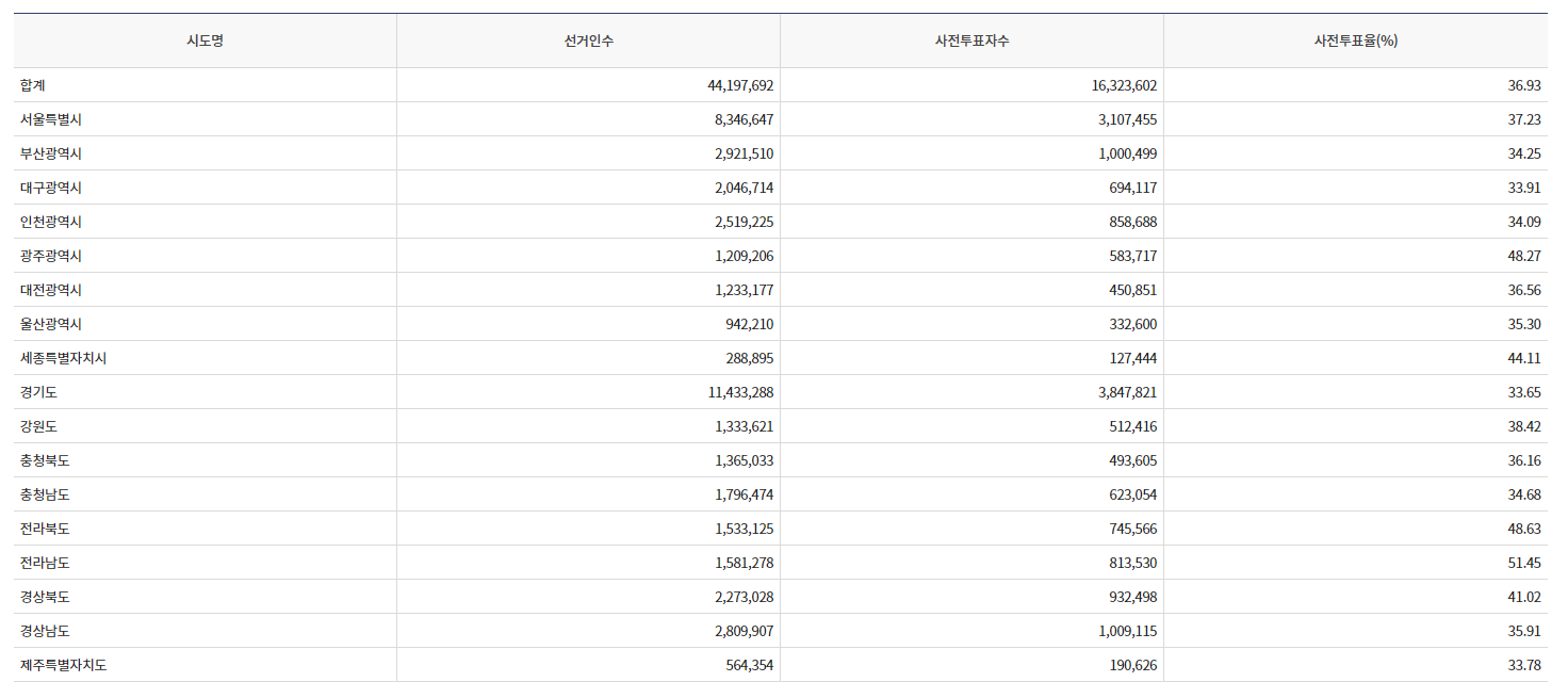 20대 대통령 선거의 총 유권자수는 44,197,692명이며 이중 사전 투표에 참여한 유권자 수는 16,323,602명으로 최종 투표율은 36.93%로 집계되며 역대 최고치를 기록했습니다. 직전 최고 기록은 2020년 총선의 26.69%였습니다. 19대 대선의 사전투표율은 26.06%였으니 10% 이상을 상회하는 놀라운 투표율입니다.