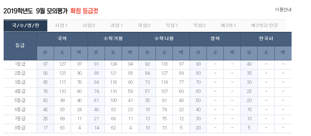점수에 따라 등급이 가려지게 되는데 등급컷은 해당 등급을 맞을 수 있는 최저 점수를 의미하는 것으로 중요한 측정 자료입니다. 모의고사 결과가 나오면 등급컷도 같이 제공이 되는데 지난해 9월 EBSI에서 제공한 등급컷을 참고하시기 바랍니다. 많은 수험 관련 기관에서도 제공하고 있으니 역시 참고하면 되겠습니다.