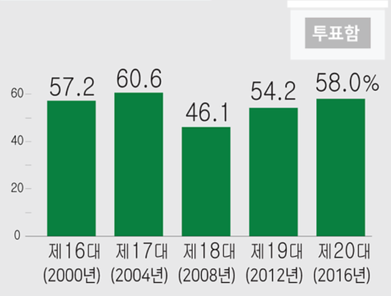 이후 독재 시대를 거치는 와중에도 꾸준히 70% 이상은 유지했는데 1992년에 있었던 제14대 국회 투표율 71.9%를 끝으로 곤두박질 치기 시작하여 급기야 2008년 4월에 있었던 제18대 총선에서는 사상 최저인 46.1%까지 떨어진 적도 있습니다. 이때는 이명박 정권 시절로 당시 야당인 민주당의 존재감이 희미하던 시기로 그런 분위기와 무관하지 않았던 결과입니다. 19, 20대에는 각각 54.2%, 58.0%를 기록하며 올라가기 시작했지만 여전히 대선이나 지방선거보다 뒤쳐지는 투표율을 기록하고 있습니다.