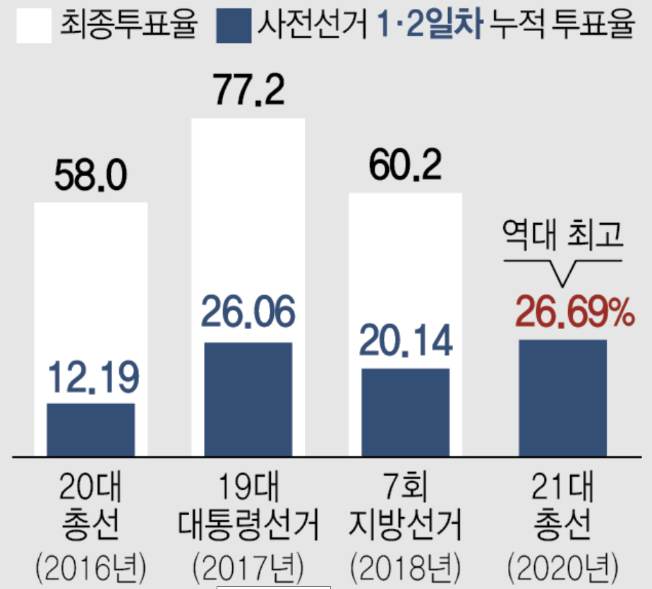 물론 코로나 와중이라 당일 혼잡을 피하고자 하는 심리로 사전 투표에 많이 참여하였을 가능성도 높아 반드시 전체 투표율이 올라간다는 보장은 없습니다. 그러나 이번 총선에 쏠린 관심을 감안하면 직전 선거에 비하면 더 올라갈 것은 확실시 됩니다.