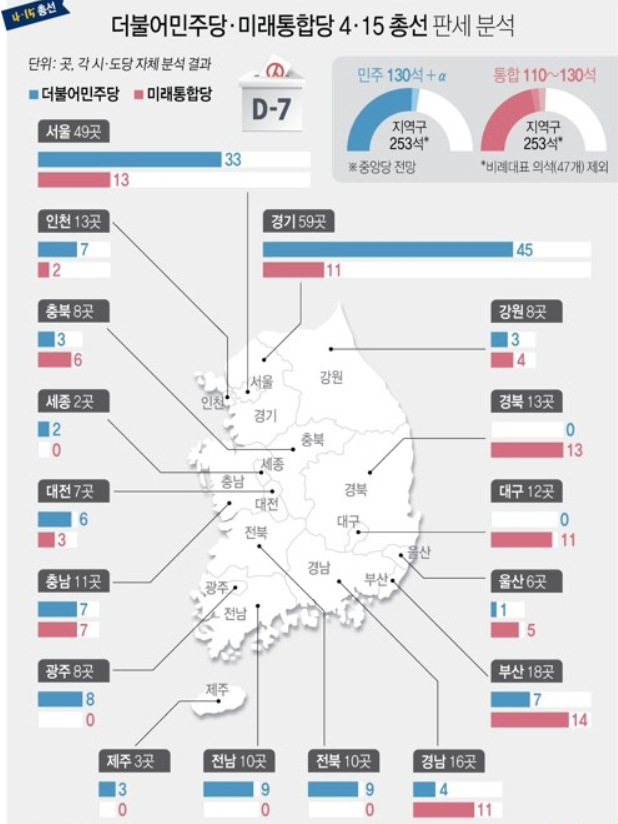 4월 8일 한국경제신문이 여론조사기관인 입소스에 의뢰하여 6~7일 이틀 실시한 조사에서는 지역구 선호 정당 질문에 민주당은 47.7%, 통합당은 28.3%로 발표됐습니다. 지역으로 보면 가장 많은 의석이 걸린 수도권 서울에서 민주당은 46.1%, 경기/인천 지역 52.5%의 지지율을 받아 수도권에서 유리한 판세인 것 같습니다. 지난 선거에서 민주당은 82석을 얻은 바 있는데 이번 선거에서는 90석 정도를 목표로 하고 있습니다.