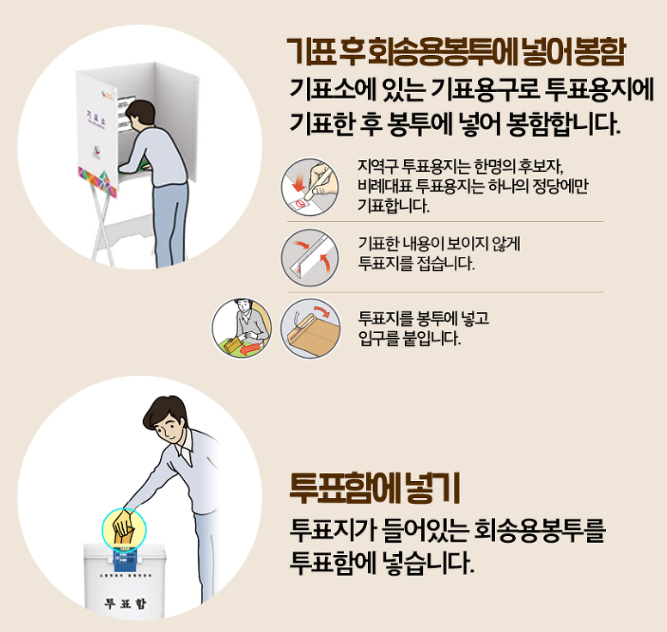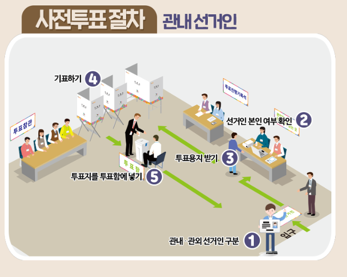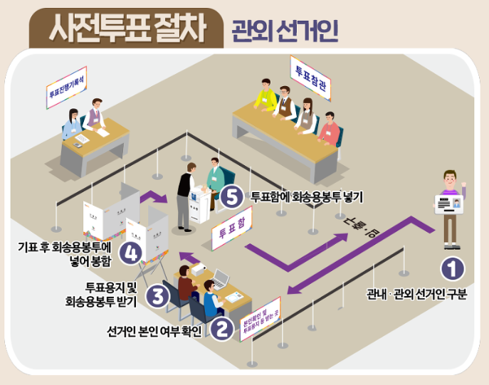 사전투표소는 관내선거인과 관외 선거인으로 구분되어 있어 투표 시 안내에 따라 투표를 하면 됩니다. 방문한 사전 투표소가 본인의 선거구이면 관내선거인, 다른 지역이면 관외 선거인입니다. 투표 방식은 약간 차이가 있는데 관내 선거인은 투표를 마치고 투표함에 용지를 넣으면 끝이며, 관외 선거인은 투표 용지와 회송용 봉투를 같이 받아서 기표를 마친 뒤 용지를 봉투에 넣어 밀봉한 후에 투표함에 넣으면 됩니다. 사전 투표소에서 별도 안내를 하겠지만 어느 쪽인지 잘 확인할 필요가 있겠습니다.