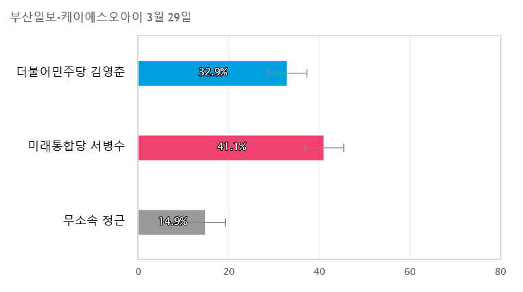 김영춘 후보는 이곳에서 재선을 노리고 있는데 상대방인 부산시장 출신인 통합당의 서병수 후보가 전략 공천되면서 어려운 승부가 되고 있습니다. 가장 최근 여론 조사를 살펴보면, 부산일보가 케이에스오아이에 의뢰하여 25일부터 26일까지 해당 지역구민을 상대로 실시한 조사에서 김영춘 후보는 32.9%, 서병수 후보는 41.1%를 기록한 결과가 나왔습니다. 그 밖의 사항은 중앙선거여론조사심의위원회 홈페이지를 참조하면 되겠습니다. (https://www.nesdc.go.kr/)