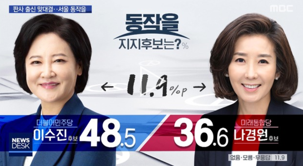 현재 이 지역구의 판세를 보면 대체로 민주당의 이수진 후보가 앞서가고 있는 것으로 보입니다. 가장최근 여론 조사를 보면 MBC가 코리아리서치인터내셔널 의뢰하여 지난 28일부터 29일까지 서울 동작을 지역 유권자를 대상으로 실시한 결과에서 이수진 후보는 48.5%, 나경원 후보는 36.6%를 기록하였습니다. 그 밖의 사항은 중앙선거여론조사심의위원회 홈페이지를 참조하면 되겠습니다. (https://www.nesdc.go.kr/)