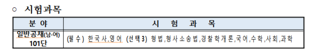 101경비단을 포함한 순경 공채 시험으로 알아보도록 하겠습니다. 필기 시험의 중요성은 매우 큽니다. 전체 비중에서 50%을 차지하고 있으며 신체, 체력 테스트를 가기 위해서 반드시 통과해야 하는 관문입니다. 현재 필수 과목은 한국사, 영어가 있으며 선택 과목으로 형법, 형사소송법, 경찰학개론, 국어, 수학, 사회, 과학 중 3과목 선택입니다.