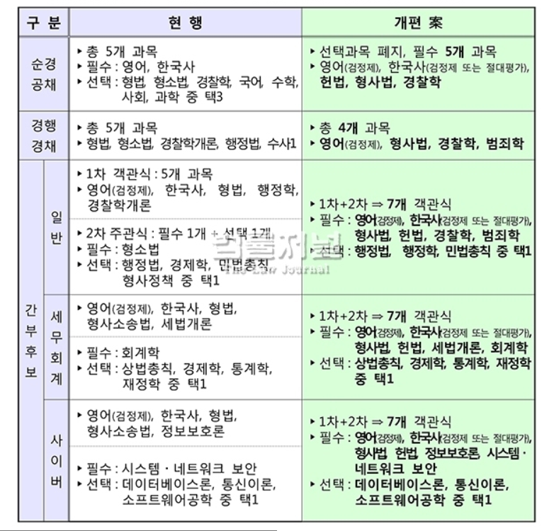 경찰공무원 시험과목 개편에 대한 행정 예고가 있었는데 아마도 2022년 상반기부터 적용될 것으로 보입니다. 개편안에 따르면 선택과목은 폐지하고 필수 과목을 5개 과목을 지정하여 보도록 할 예정입니다. 필수 과목은 영어, 한국사, 헌법, 형사법, 경찰학 등이며 이 중에서 영어와 한국사는 검정제 또는 절대 평가로 대체 예정입니다. 아마도 토익이나 텝스 또는 다른 자격 점수로 평가하려는 것으로 예상됩니다.