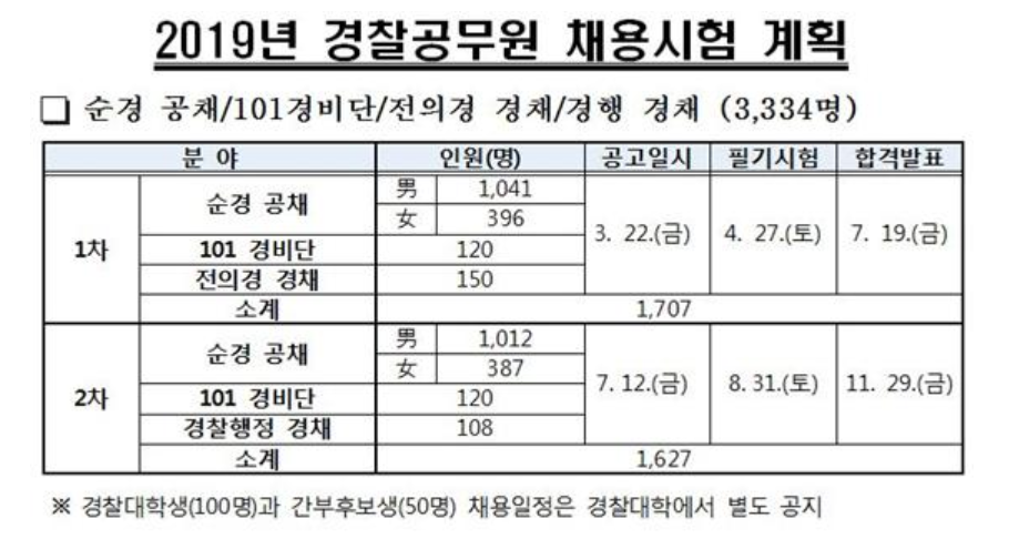 드라마나 영화에서도 많이 등장하는 경찰공무원은 공무원으로서의 사명감과 사법경찰이라는 말과 같이 각종 범죄를 수사하고 검찰을 보조하여 치안 업무의 한 축을 담당하고 있는 주요 국가직 공무원입니다. 공무원은 취업을 준비하는 대학생이나 졸업생들이 선호하는 직업 군인데 4명중 1명이 공무원 시험을 준비하고 있다고 하니 인기가 대단한 것 같습니다. 9급이나 7급보다는 못하지만 경찰 공무원에 대한 인기도 계속 올라가고 있습니다. 2019년의 경우 채용 인원은 순경 공채, 경찰행정 공채 등을 포함하여 3,334명입니다.