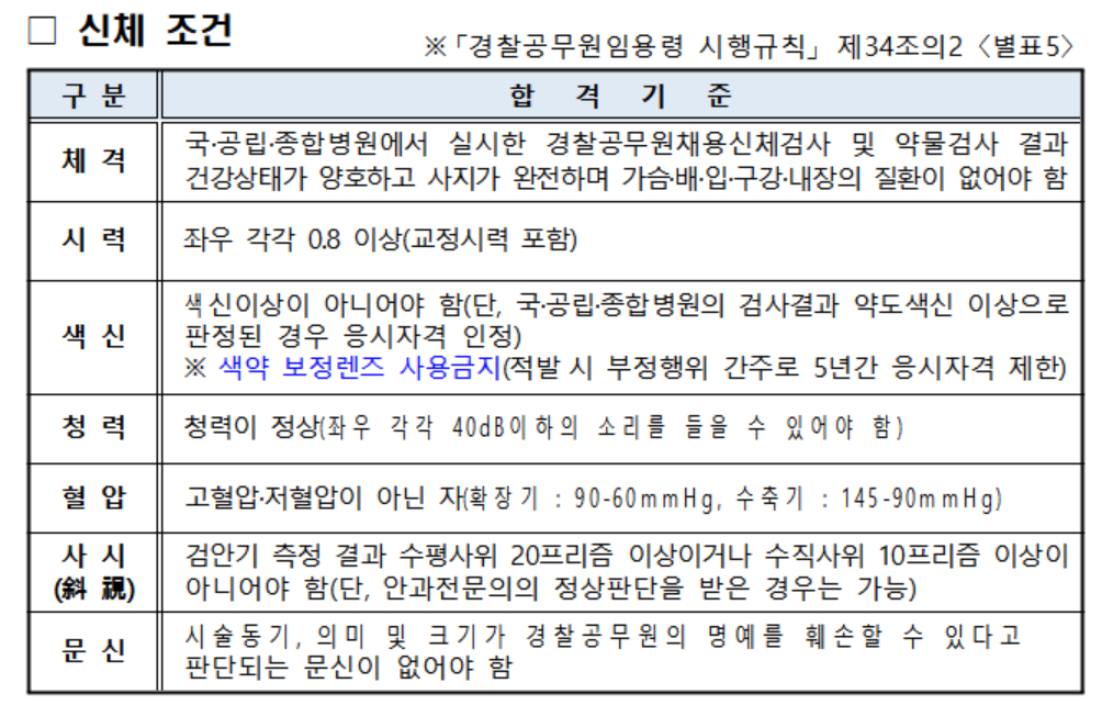 신체 조건, 신체 검사 기준은 조금 까다로운 편입니다. 신체 조건으로는 건강상태가 양호하고 약물검사에 이상이 없어야 합니다. 101 경비단의 경우만 신장 170cm이상을 요구하며 다른 경찰 직은 별도로 신장 조건은 없습니다. 색맹, 색약은 없어야 하며 시력은 교정시력 포함 0.8이상이면 됩니다. 쳥력은 양쪽 40db이상을 들을 수 있으면 됩니다.확장기, 수축기혈압이 저혈압(60~90mmhg미만) 또는 고혈압(90~145mmhg초과)에 해당하면 지원이 안되니 관리가 필요하겠습니다. 문신은 하지 않는 것이 좋겠습니다. 시술 동기 등을 본다고 하지만 아무래도 없는 것이 유리할 것입니다.