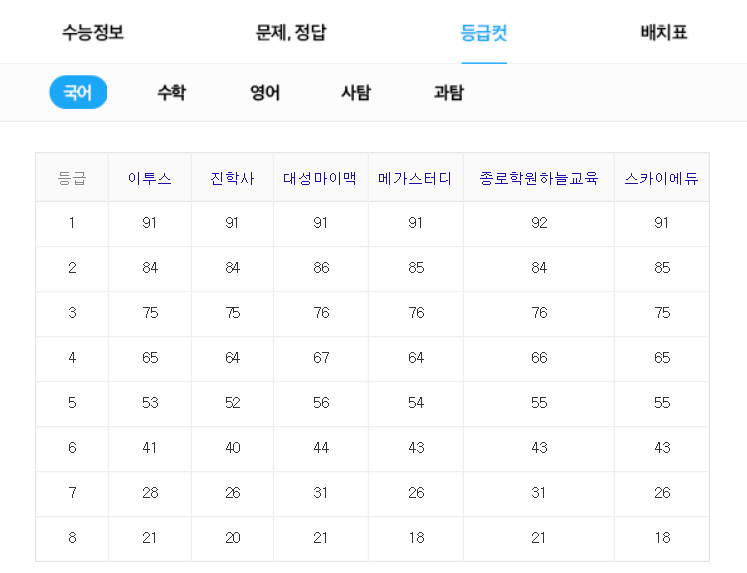 2019년 수능 국어의 경우 1등급 기준 등급컷 표준점수는 132점이었으며 원점수로 환산했을 때 84점이었습니다. 표준 점수 최고점은 150점으로 2018년 수능과 비교하면 만점자가 3,214명에서 148명으로 급 감소하였던 것을 보면 상당히 어려웠던 과목으로 당락에 큰 영향을 끼쳤던 것으로 분석됩니다. 1등급 인원도 감소하였던 것을 보면 상대적으로 쉽게 출제되었던 사회탐구영역에서 만점이 많이 나왔던 것을 감안하면 인문계 상위권 수험생들에게는 큰 변수였을 것입니다. 국어만큼은 불수능이라는 말이 왔을 만큼 체감 난이도가 높았으니 상위권뿐만 아니라 중위권 학생들에게도 적지 않게 어려움이 많았을 것 같습니다.