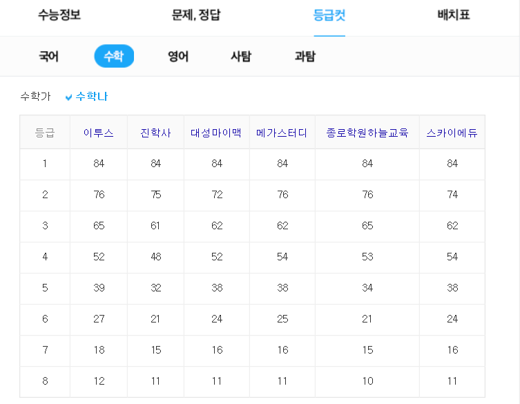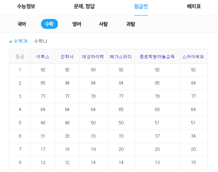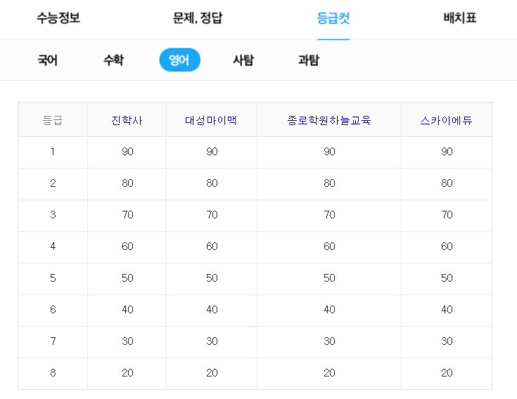 2020 수능 예상 등급컷, 난이도 정보, 2019 수능 등급컷 참고