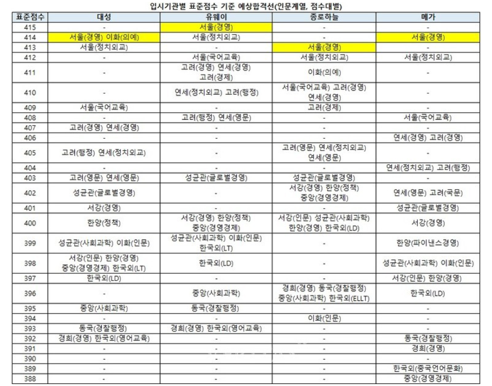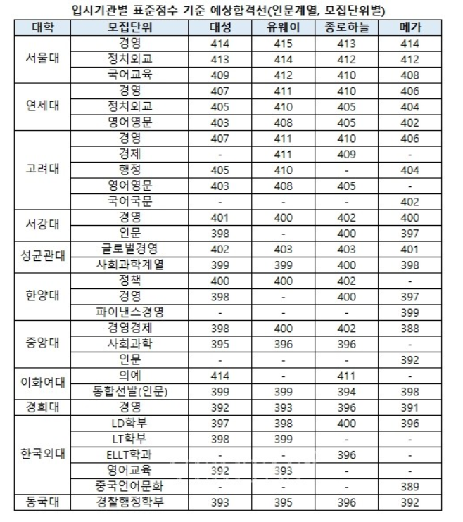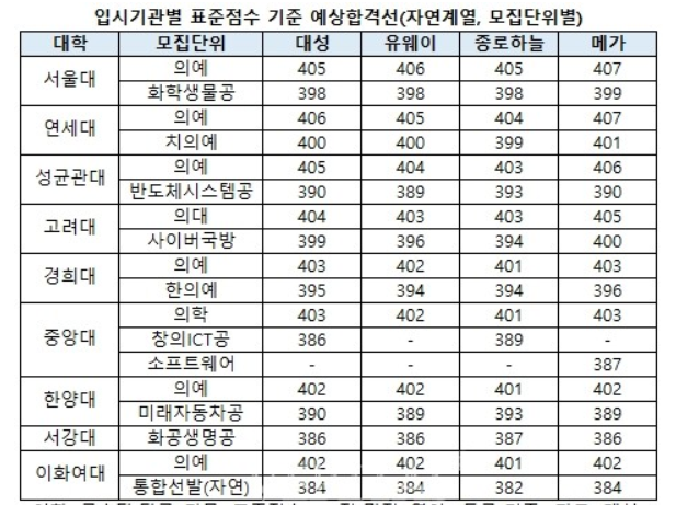 대성학원, 종로하늘, 유웨이, 메가, 진학사 등 입시기관에서는 표준점수 기준으로 예상 합격선을 내놓았습니다. 자연계에서 가장 높은 단위인 서울대 의대는 407점이상,인문계 최상위인 서울대 경영대는 413~415점으로 예상되고 있습니다. 주요대학 의대는 최소 400점 이상으로 보고 있습니다. 또한 서울 주요 대학의 인문계 합격선은 최소 388점, 자연계는 385점 선으로 예상됩니다. 백분율로 보면 서울 주요대학은 94이상, 수도권 상위권 대학은 인문계 86, 자연계 83 정도로 전망을 내놓았습니다.