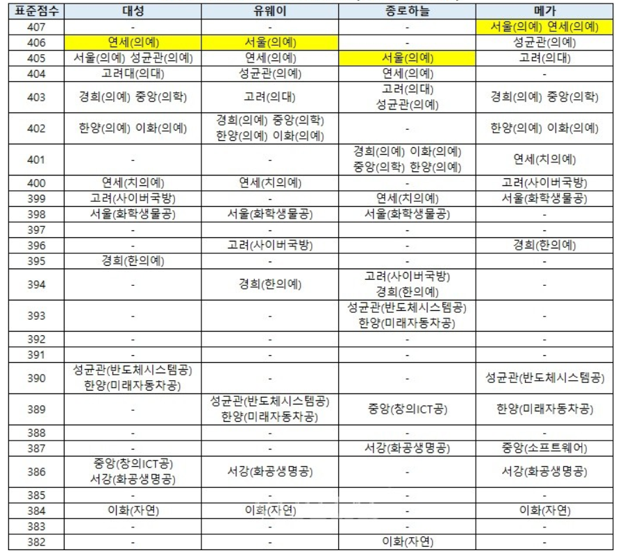 정시배치표에 따른 예상 합격선