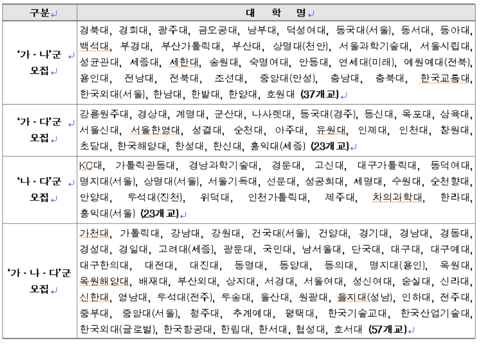 2020 정시 등급별 지원 가능대학, 정시 가나다군 대학 알아보기