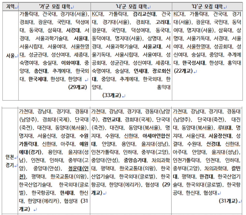 2020 정시 가나다군 대학