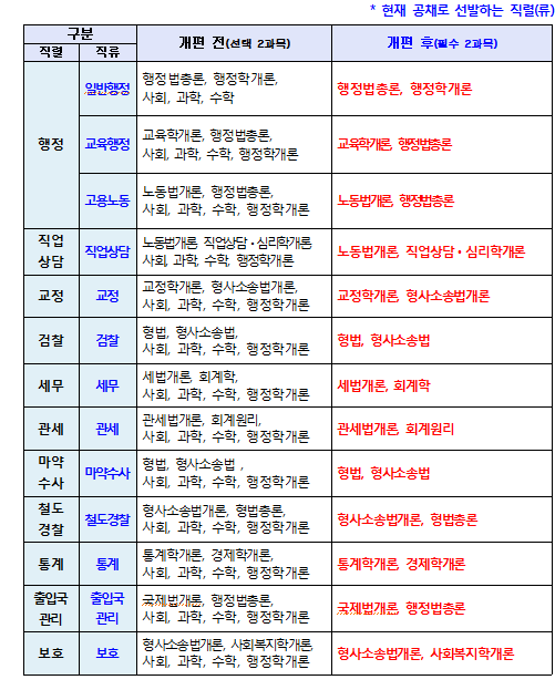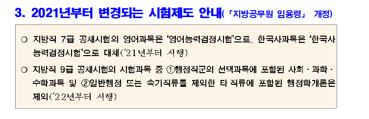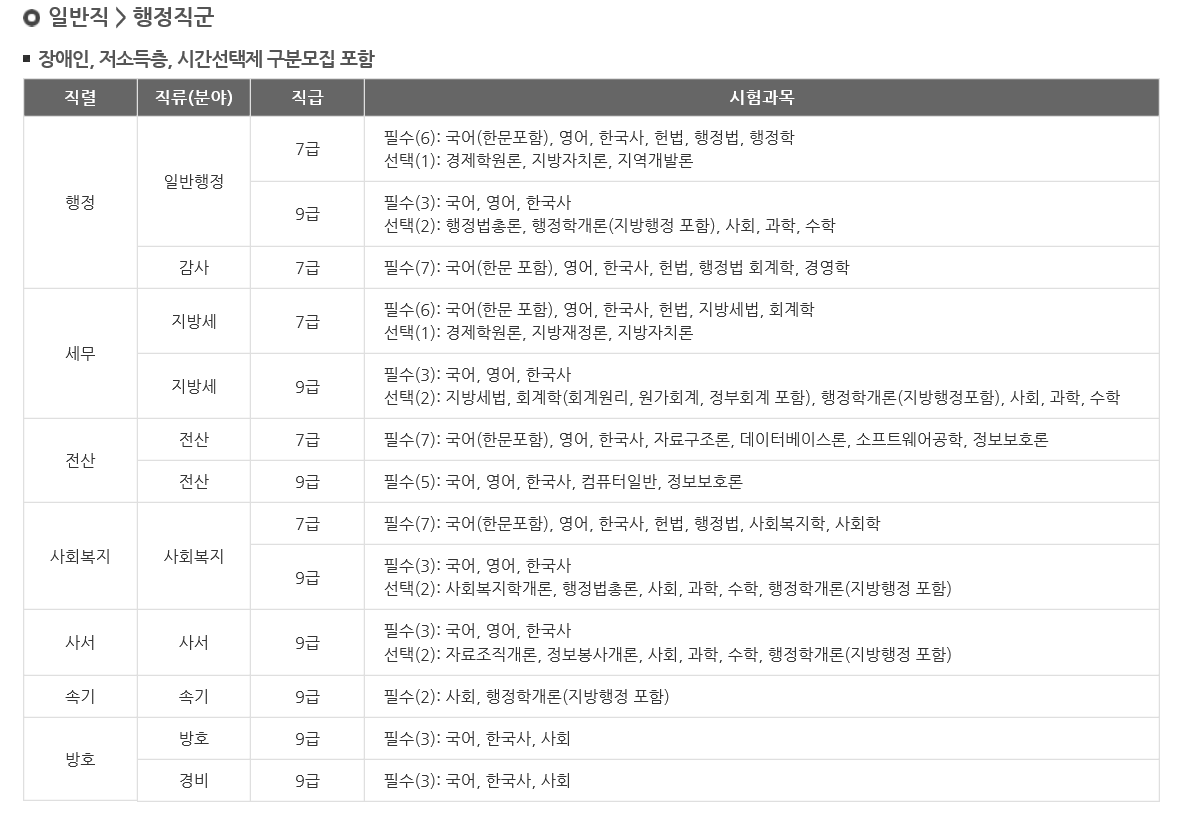 서울시 공무원 시험 과목은 행정직군 기준으로 9급은 국어, 영어, 한국사 3과목이 필수이며 선택과목으로 행정법총론, 행정학개론, 사회, 과학, 수학 중 두 과목을 선택할 수 있습니다. 각 시험 문항은 20문항이며 4지선다형으로 출제되며 시험 시간은 20분입니다. 시험에 대한 일부 개편이 있을 예정인데 2022년 시험부터는 선택과목 중 사회, 과학, 수학이 폐지되고 대신 행정법총론과 행정학개론이 필수로 들어갈 예정입니다.