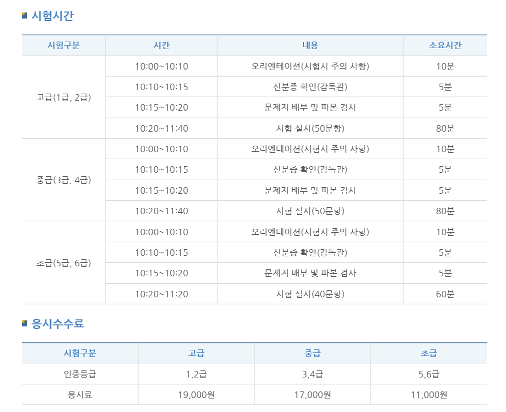 시험시간은 현재 47회 경우 아직 업데이트가 안되어 있는데 46회 기준 고급 1~2급을 보면 아침 10시부터 10시 20분까지 시작하여 오리엔테이션, 신분증 확인, 문제지 배부 후 10시 20분부터 11시 40분까지 80분간 본 시험을 치르게 됩니다. 47회 시험의 경우도 큰 틀은 바뀌지는 않을 것으로 예상됩니다.