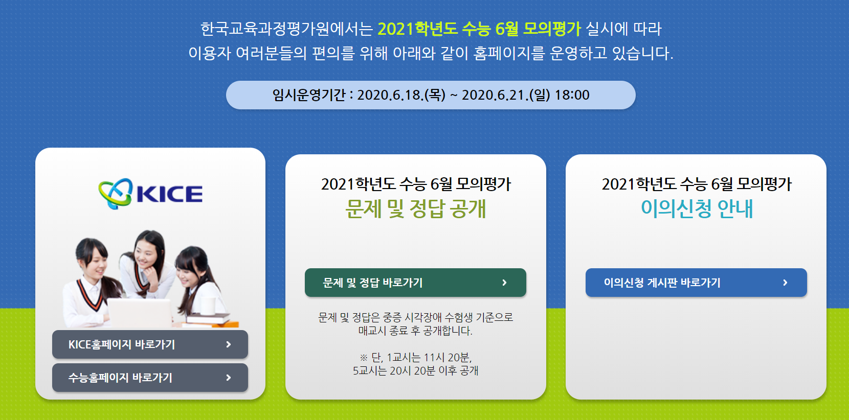 한국교육과정평가원에서는 2021학년도 수능 6월 모의평가 실시에 따라 이용자 여러분들의 편의를 위해 아래와 같이 홈페이지를 운영하고 있습니다. 임시운영기간 : 2020.6.18.(목) ~ 2020.6.21.(일) 18:00