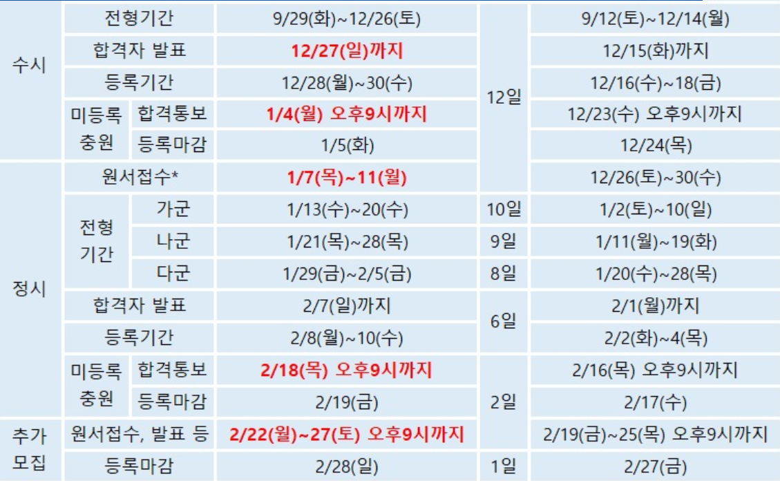 수시모집 미등록 충원 합격, 추가 합격은 1월 4일까지입니다. 워낙 많은 대기자들이 있기 때문에 이 시기에는 합격 후 확인을 하지 못하여 다음 순번으로 넘어가지 않도록 주의를 기울여야 합니다. 수시 모집 합격자 등록은 12월 28일부터 30일까지입니다.