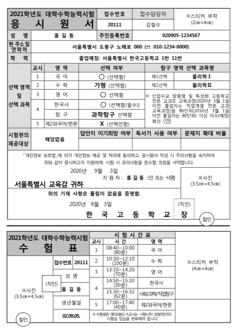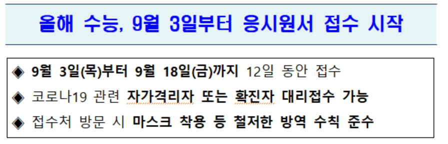 코로나로 어려운 이때 유달리 태풍마저 잦은 2020년입니다. 90여 일 남아있는 대학 입학 수학능력 시험을 앞두고 9월 3일, 오늘부터는 시험 응시원서 배부, 접수, 변경 일정이 시작됐습니다. 이번 수능 원서접수 기간은 9월 3일부터 9월 18일까지로 주말을 제외하고 12일간 이어지며 이 기간 중 수험생 본인이 치르게 될 과목 영역을 선택하고 변경하거나 취소할 수 있는 기간입니다.