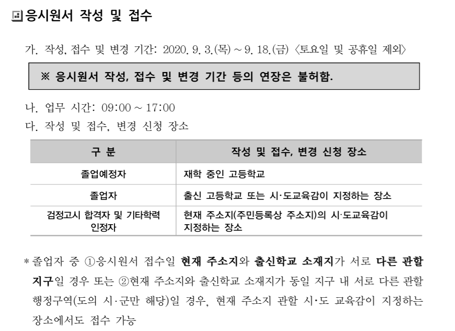 고등학교 3학년 학생들은 학교에서 일괄 접수하므로 학교의 지침만 잘 따르면 되겠습니다. 고등학교 졸업생은 본인이 졸업한 학교로 가서 접수하면 되는데 현재 사는 곳이 졸업한 학교와 주소가 다르다면 현재 주소지 관할 시험지구 교육지원청에서도 접수가 가능합니다.
