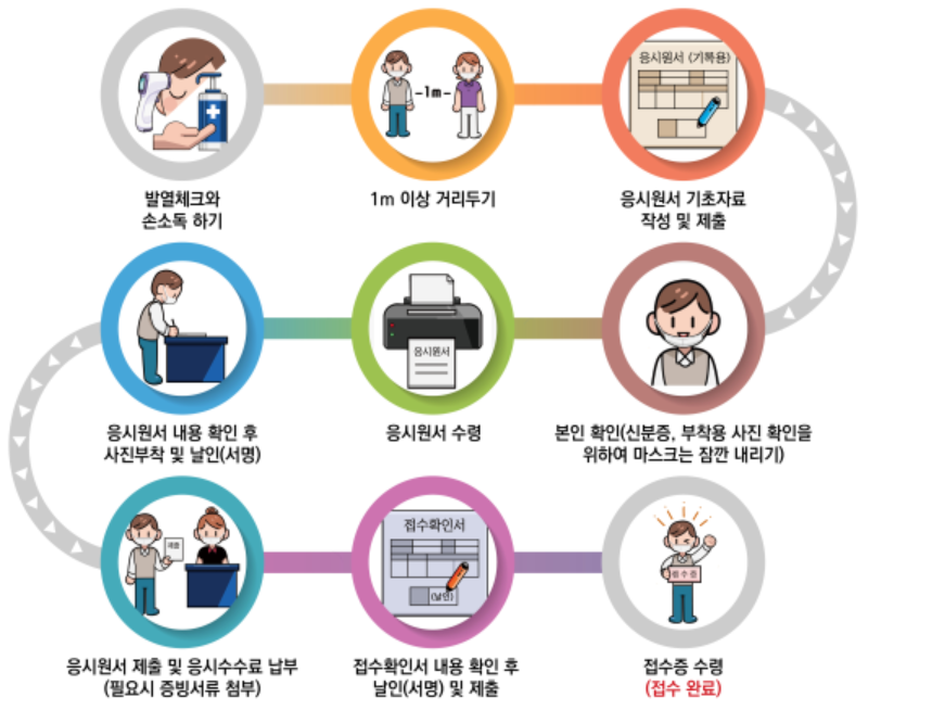응시자는 접수처에 있는 응시원서 기초자료를 작성, 제출하면 접수처에서는 응시원서를 출력하여 교부합니다. 이후 출력된 응시원서 내용을 확인하고 규격 사진인 여권용 사진을 부착하고 서명을 하고 원서 접수자에게 제출, 응시료를 납부하고 접수 확인서를 받아 서명, 제출 후 접수증을 받으면 모든 절차가 종료됩니다. 이와 같이 본인이 직접 접수를 하는 것이 원칙이지만 코로나 19 확진자이거나 자가 격리 중이라면 대리 접수도 가능합니다.
