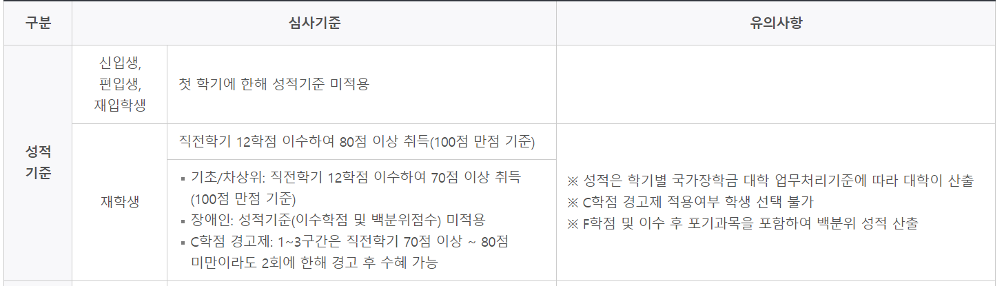 장학재단에서 공지한 내용을 더 보면 재학생들은 대한민국 국적으로 국내 대학에 재학 중인 학자금 지원 소득분위 8구간 이하 대학생 중 성적기준 충족자로 해당학기 국가장학금 신청절차(가구원 동의, 서류제출)를 완료하여 소득수준이 파악된 학생들입니다. 장학금 수령 기준으로 전 학기 12학점 이수하고 80점 이상(B학점) 취득한 학생들이 자격을 갖추게 됩니다. 여기에 소득 분위로 8구간 이하이면 자격을 갖추게 됩니다.